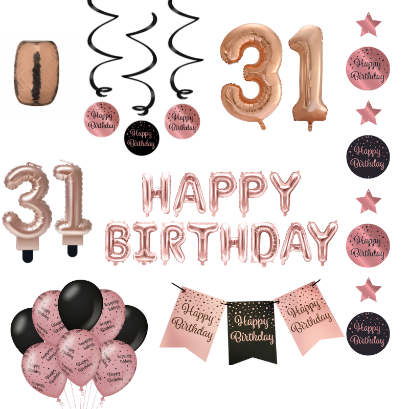 31 jaar Verjaardag Versiering pakket rose gold. Vier je de verjaardag voor iemand die 31 jaar wordt? Met dit verjaardag versiering pakket versier je de verjaardag op een super mooie manier. In de verpakking ontvang je: Happy Birthday folieballon, cijferballon (41cm), lint, 3 Swirl decoraties, Hang decoratie, vlaggenlijn, cijferkaarsen en verjaardag ballonnen.