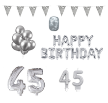 Wil je iemand echt verrassen op zijn of haar verjaardag? Met dit 45 jaar verjaardag versiering pakket zilver creëer je een onvergetelijke sfeer. Het pakket bevat prachtige zilveren cijferballonnen, Happy Birthday letterballonnen, spiegelballonnen en metal
