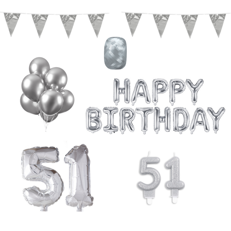 Wil je iemand echt verrassen op zijn of haar verjaardag? Met dit 51 jaar verjaardag versiering pakket zilver creëer je een onvergetelijke sfeer. Het pakket bevat prachtige zilveren cijferballonnen, Happy Birthday letterballonnen, spiegelballonnen en metal