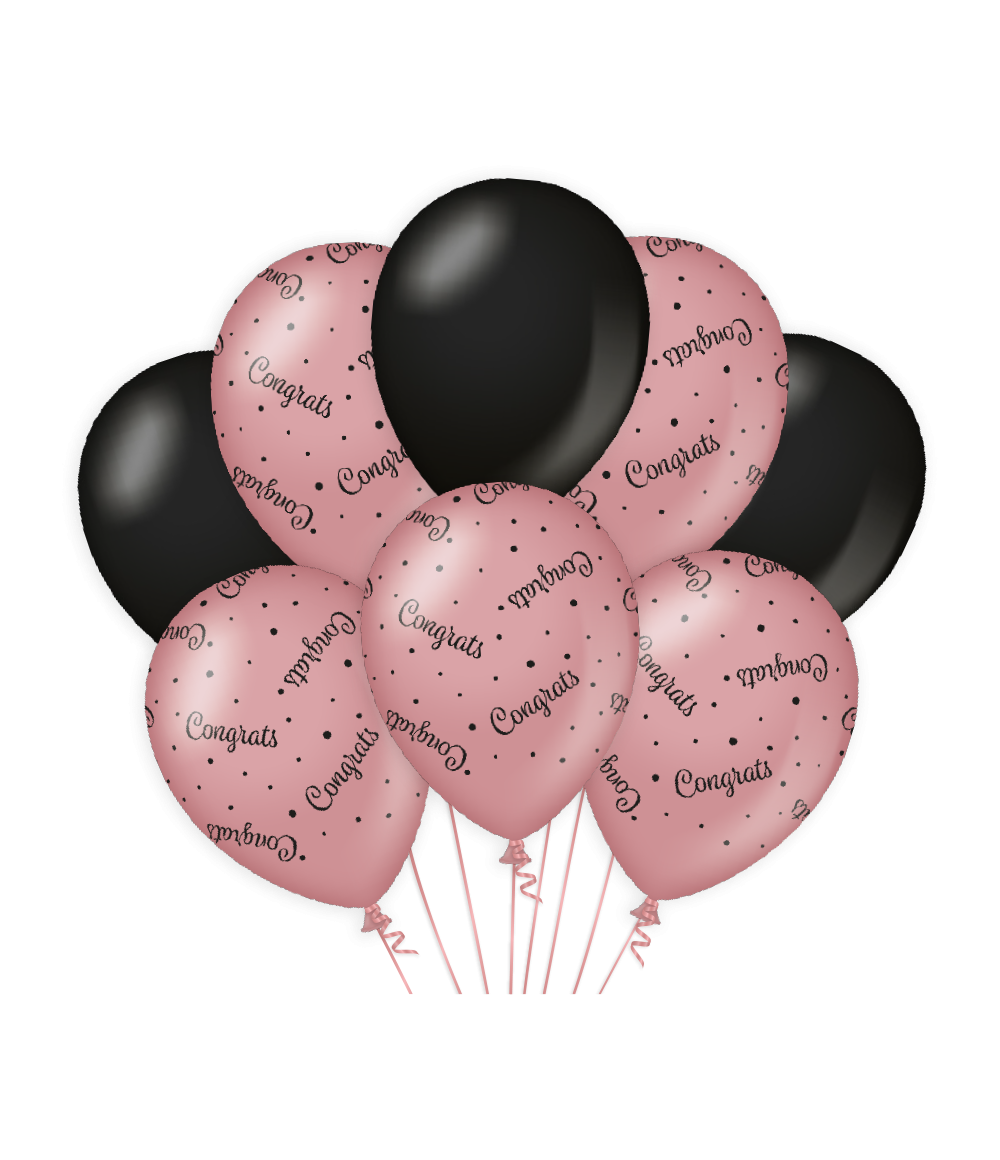 Congrats ballonnen rose goud en zwart 8 stuks. 8 Mooie luxe rose gouden en zwarte ballonnen, 5 in de kleur rose goud met Congrats opdruk en 3 zwarte decoratie ballonnen met een afmeting van 30cm