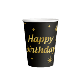 Stijlvolle Happy Birthday papieren bekers (8 stuks, 250ml) in zwart met gouden tekst en versiering. Perfect passend bij ...