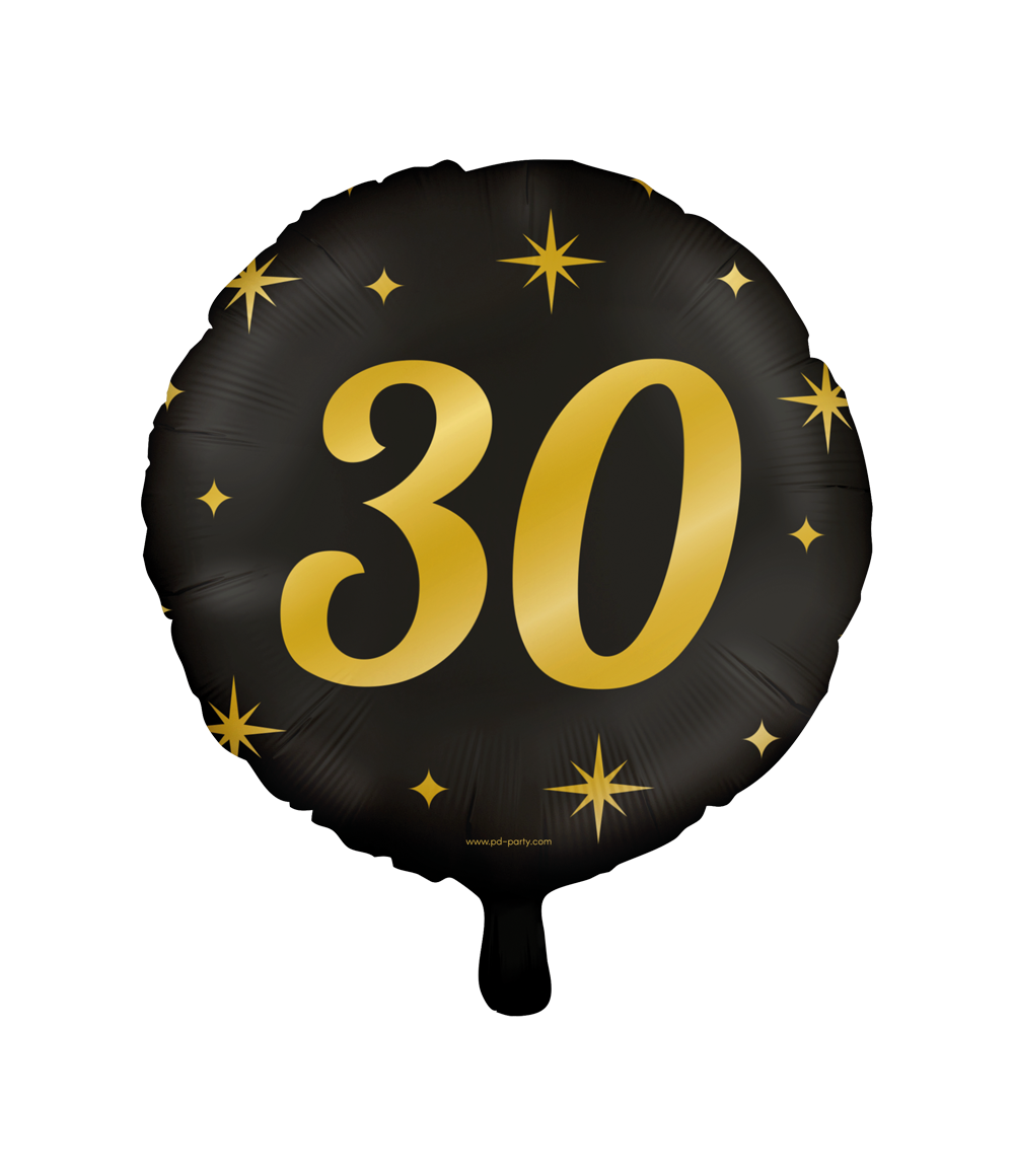 Folieballon (45 cm) "30 jaar" in zwart met gouden cijfers en sterren. Perfecte aanvulling op "Classy Party"-versiering. Leeg (€ 2,95) of gevuld met helium (€ 13,95). Geleverd in een vrolijke doos met ballongewicht.