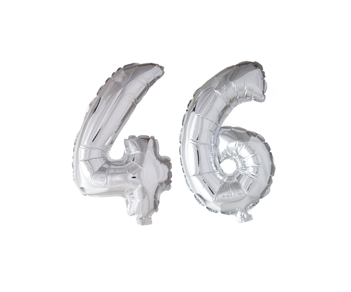 Folieballon cijfer 46 Zilver 66cm, leeg bezorgd met rietje. Deze XL folieballon met cijfer 46 is erg leuk voor een feestje, verjaardag, jubileum of bruiloft.