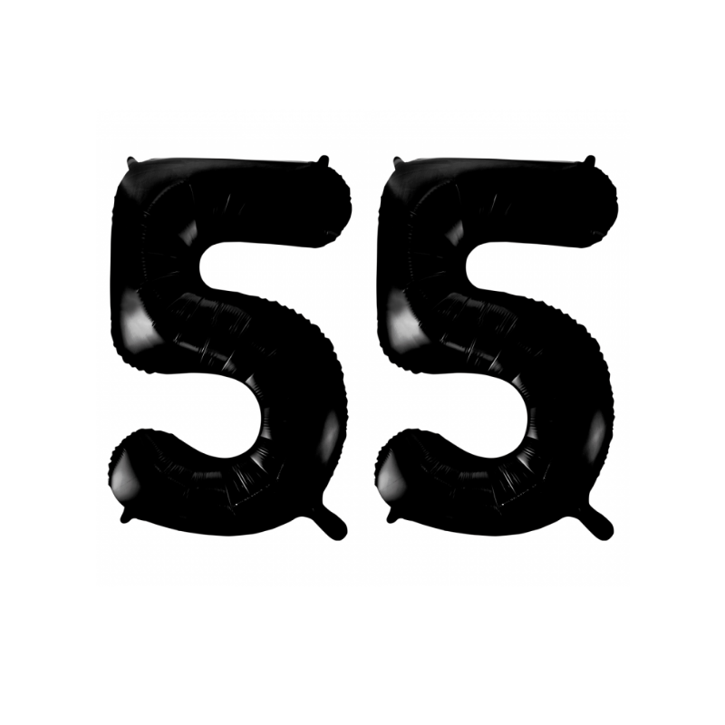 Folieballon cijfer 55 zwart 86cm, leeg bezorgd met rietje. Deze XL folieballon met cijfer 55 is erg leuk voor een feestje, verjaardag, jubileum of bruiloft.