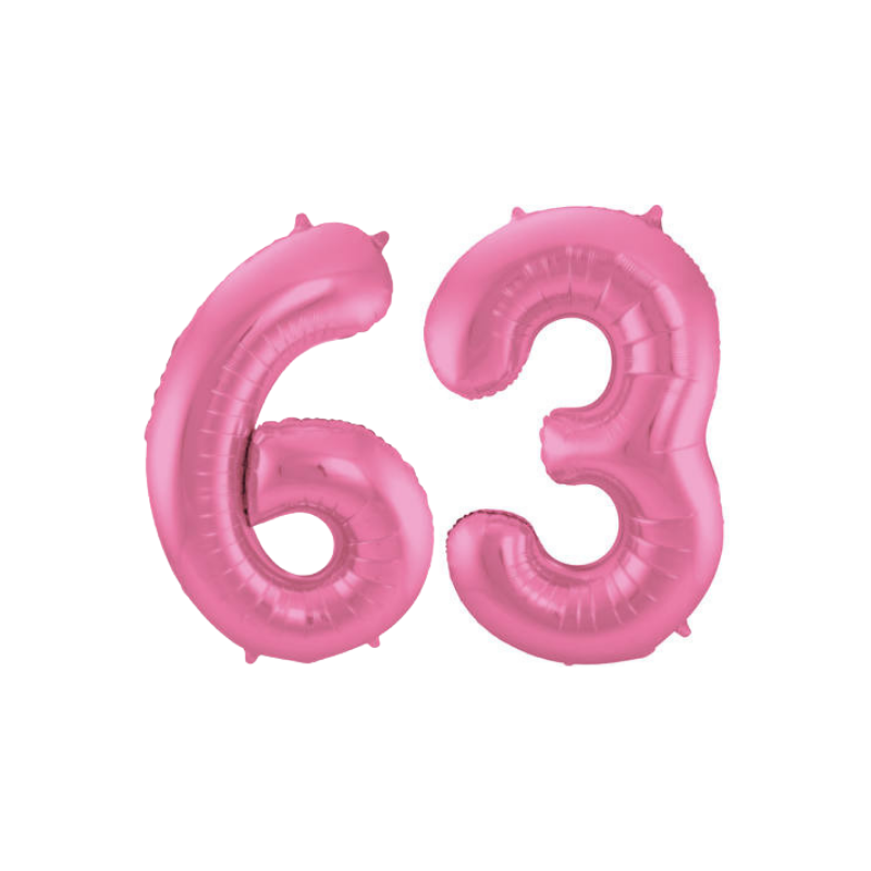 Folieballon cijfer 63 metallic roze mat 86cm, leeg bezorgd met rietje. Deze XL folieballon met cijfer 63 is erg leuk voor een feestje, verjaardag, jubileum of bruiloft.