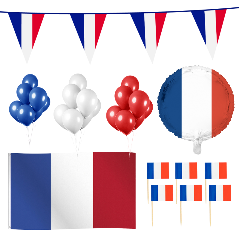 Frankrijk feestpakket L – vlag, ballonnen, prikkers & versiering