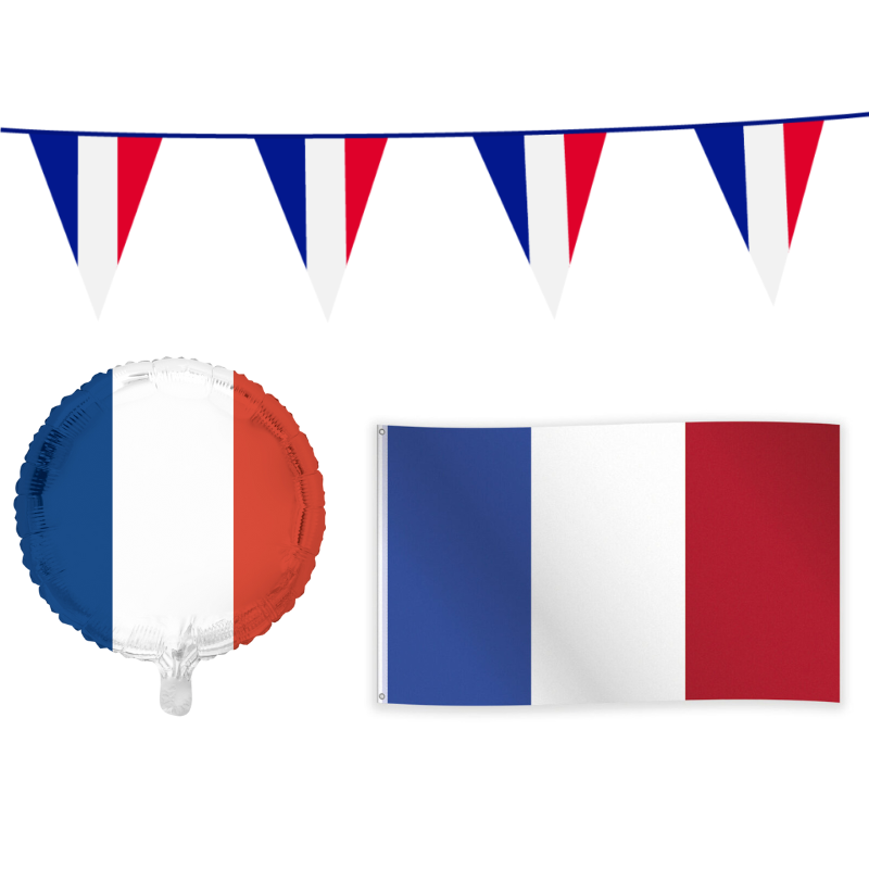 De set bevat een vlaggenlijn van maar liefst 10 meter, bedrukt met de Franse vlag. Perfect om door de kamer, over het balkon of langs de schutting te hangen. De folieballon van 46 cm is een echte blikvanger en kan eenvoudig worden opgeblazen met lucht of helium (los verkrijgbaar). Tot slot maakt de grote gevelvlag van 90 x 150 cm het plaatje compleet: hang 'm buiten aan de gevel, balkon of binnen tegen een muur voor een groots effect.