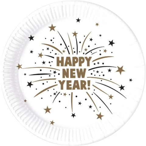 Stijlvolle papieren Happy New Year borden (23cm). Set van 8 witte borden met goudkleurige letters en feestelijke vuurwerkdecoratie in zwart en goud. Perfect voor een elegante Oud & Nieuw tafel.