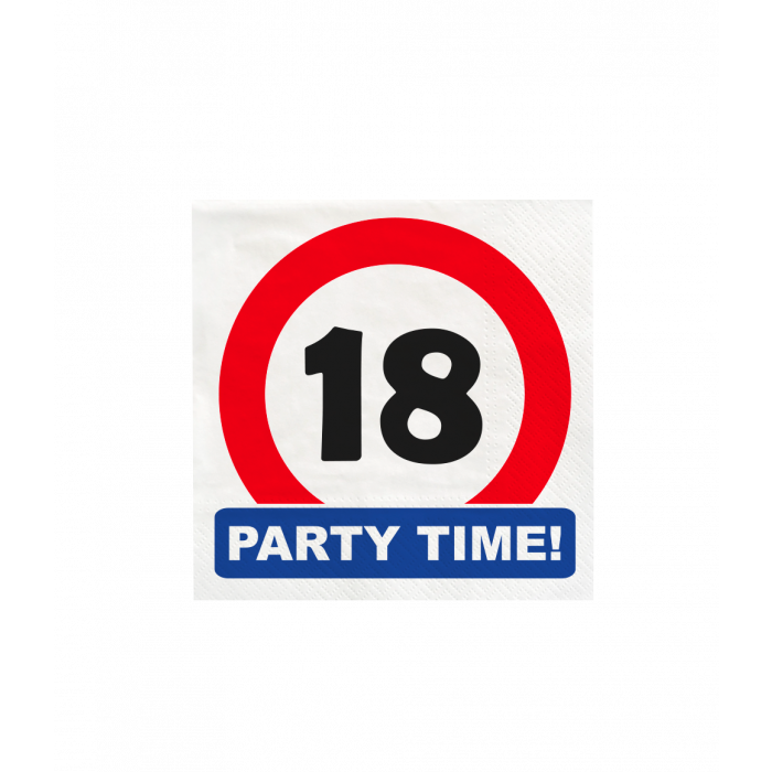 Papieren Verkeersbord servetten 18 jaar, 16 stuks, uitgevouwen 33x33 cm. Bedrukt met een verkeersbord, het cijfer 18 en de tekst 'Party Time'. Ideaal voor een 18e verjaardag of een groots feest met verkeersbord thema!