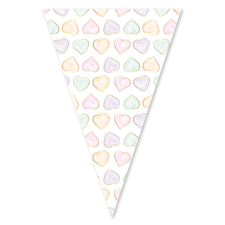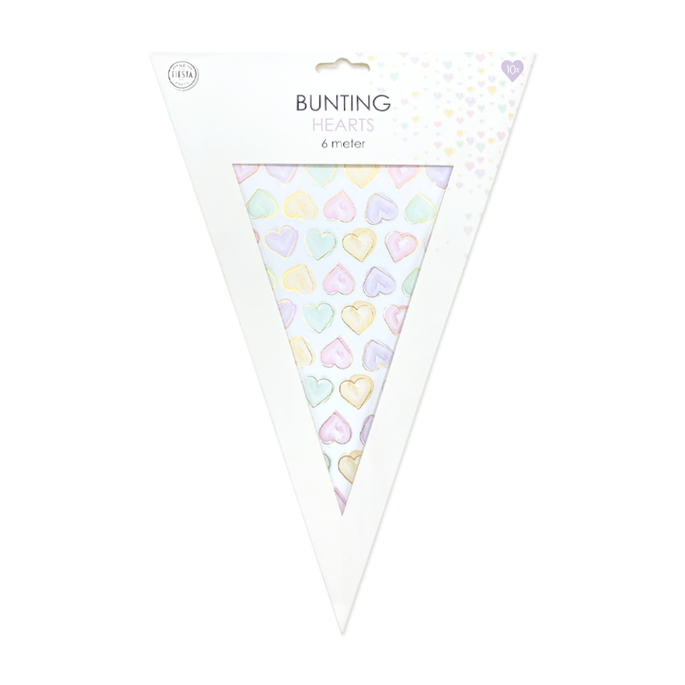 Papieren vlaggenlijn Watercolor Hearts, 6 meter lang met vlaggetjes van 20x30 cm. Versierd met pastel hartjes in roze, geel, groen en paars. Ideaal voor bruiloften, verjaardagen en babyshowers. Eenvoudig op te hangen en perfect te combineren met bijpassen