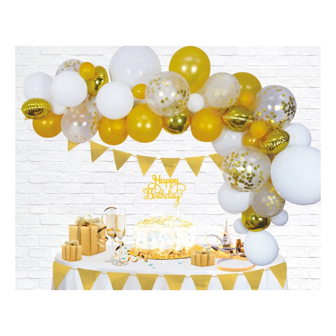 In de verpakking ontvang je 15x 5 inch witte latex ballonnen, 15x 5 inch parel goud ballonnen, 10x 12 inch witte latex ballonnen, 10x 12 inch parel goud ballonnen, 8x 12 inch confetti latex ballonnen - gouden confetti, 2x 18 inch witte latex ballonnen, 10x 10 inch ronde gouden folie ballonnen, 1x ballonslinger 4m & 40 gluedots.