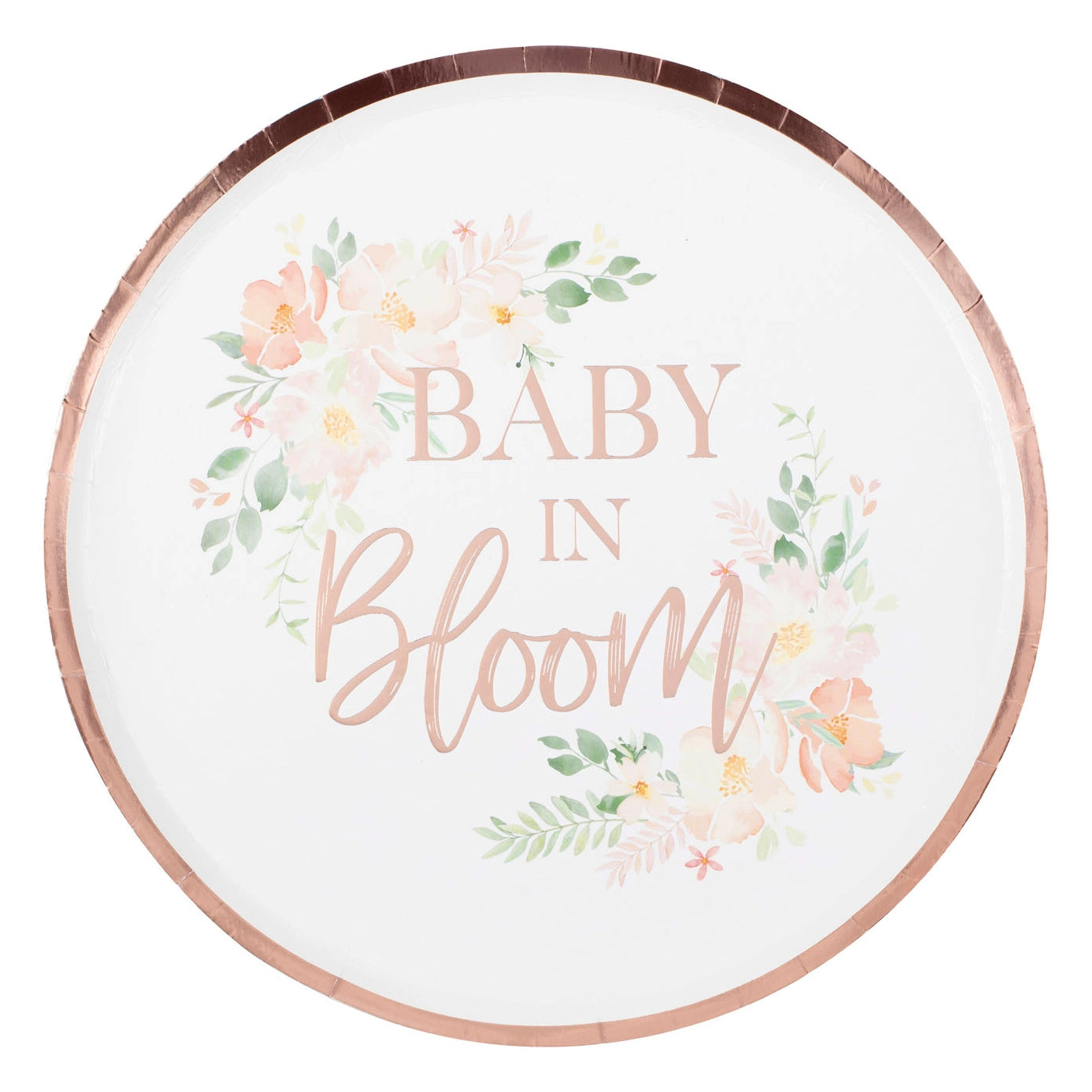 Vier je babyshower in stijl met de bordjes Baby in Bloom. De papieren bordjes zijn wit en bedrukt met de tekst Baby in Bloom in rosé goud. Ook zijn ze voorzien van een mooie bedrukking in floral thema van bloemen en blaadjes. De opstaande roségouden rand zorgt ervoor dat de muisjes niet van je bordje afrollen.