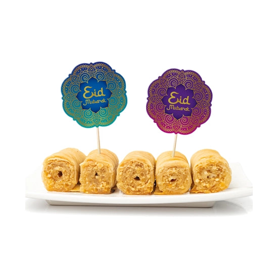 Maak jouw Eid Mubarak feesttafel helemaal af met deze luxe prikkers! De set bevat 12 stuks in 2 verschillende designs met een elegante uitstraling in goud, paars en roze. Gemaakt van stevig papier, perfect voor het decoreren van hapjes, cupcakes of desserts. Deze prikkers passen prachtig bij de WeFiesta Eid versiering en zorgen voor een feestelijke en stijlvolle tafelpresentatie.