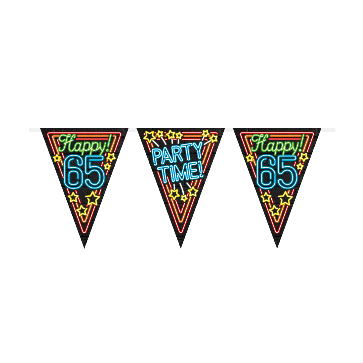 Deze slinger ziet er feestelijk uit met zijn neon kleuren. Op de vlaggetjes staan om en om het cijfer 65 en het woord party time. De lengte van deze slinger 10 meter.
