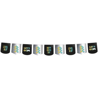 Met deze slinger maak je een verjaardag van een gamer echt compleet. Deze slinger is 1,6 meter. De slinger is voorzien van vlaggetjes met de tekst happy birthday en level up.