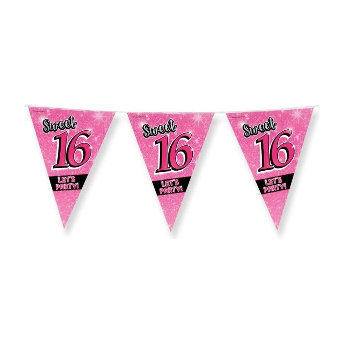 Vlaggenlijn met sweet 16 thema - 10 meter lang - 30 cm hoog - Aan 1 lijn zitten 15 vlaggetjes - Gemaakt van plastic.