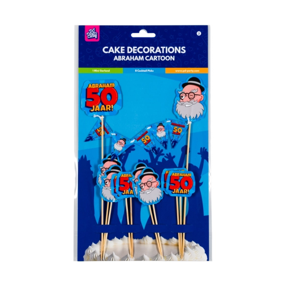 Taart decoratie Abraham Cartoon, set bestaat uit 8 prikkers + mini taart decoratie slinger. Erg unieke en leuke taart versiering voor een man die 50 jaar wordt