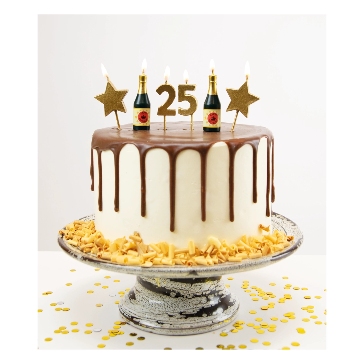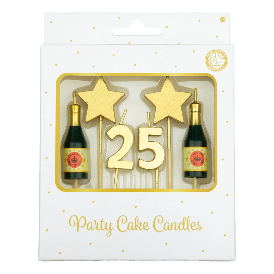 In de verpakking vind je 6 kaarsjes met een hoogte van ongeveer 5 centimeter. De set bevat twee champagneflesjes, twee sterren en de cijfers 25, allemaal in het goud. De kaarsjes zijn eenvoudig in de taart te prikken, omdat ze al op een prikkertje zijn bevestigd. Zo maak je in een handomdraai een indrukwekkende verjaardagstaart!