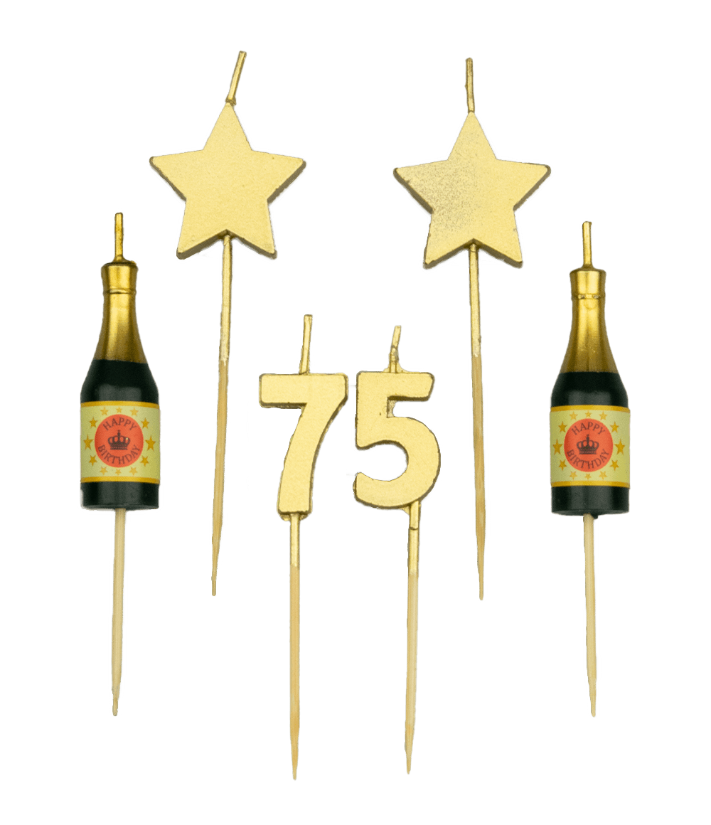 Wil je een verjaardagstaart prachtig versieren? Deze taartkaarsjes zijn perfect om een 75-jarige te verrassen. De kaarsjes in een schitterende gouden kleur maken van elke taart een feestelijk cadeau. In de verpakking vind je 6 kaarsjes van ongeveer 5 centimeter hoog: twee champagneflesjes, twee sterren en de cijfers 75. De kaarsjes zijn al op een prikkertje bevestigd, dus je kunt ze eenvoudig in de taart steken. Maak de verjaardag extra speciaal met deze luxe taartkaarsjes!