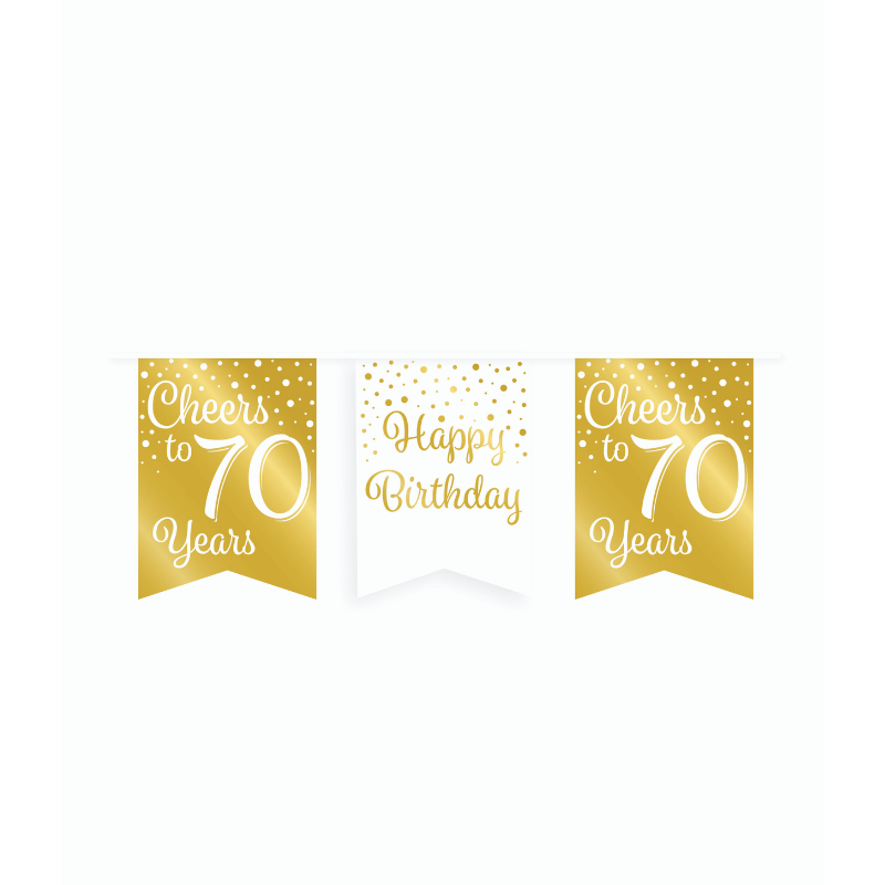 Ken je iemand die binnenkort 70 jaar wordt? Of ben je zelf jarig en ga je dit vieren? Met deze prachtige wit en goud gekleurde vlaggetjesslinger van 6 meter maak je elke verjaardag extra feestelijk!